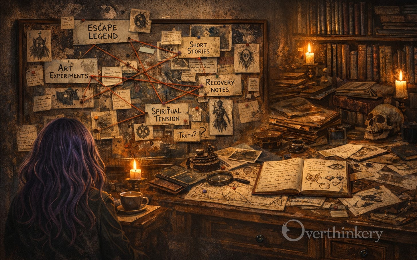 This project builds a small universe around questions like these: What happens when a creative mind pushes itself too far? Where is the boundary between insight and delusion? What role do art, belief, and storytelling play in survival? Notes and other ramblings from a chaotic and deeply overthinking mind may include: • reflective journal slivers • creative experiments in art and storytelling • flash fiction and narratives • altered perceptions on drugs, delirium, belief, and recovery • philosophical wanderings Sometimes serious. Sometimes amused. Topics you may encounter include symbolism, psychology, identity, mental health, abandonment, devotion, delusion, safety, dreams, photography, and the visual or written art of connection and containment. This guidebook will evolve. I’ll continue updating it with links as the archive grows.